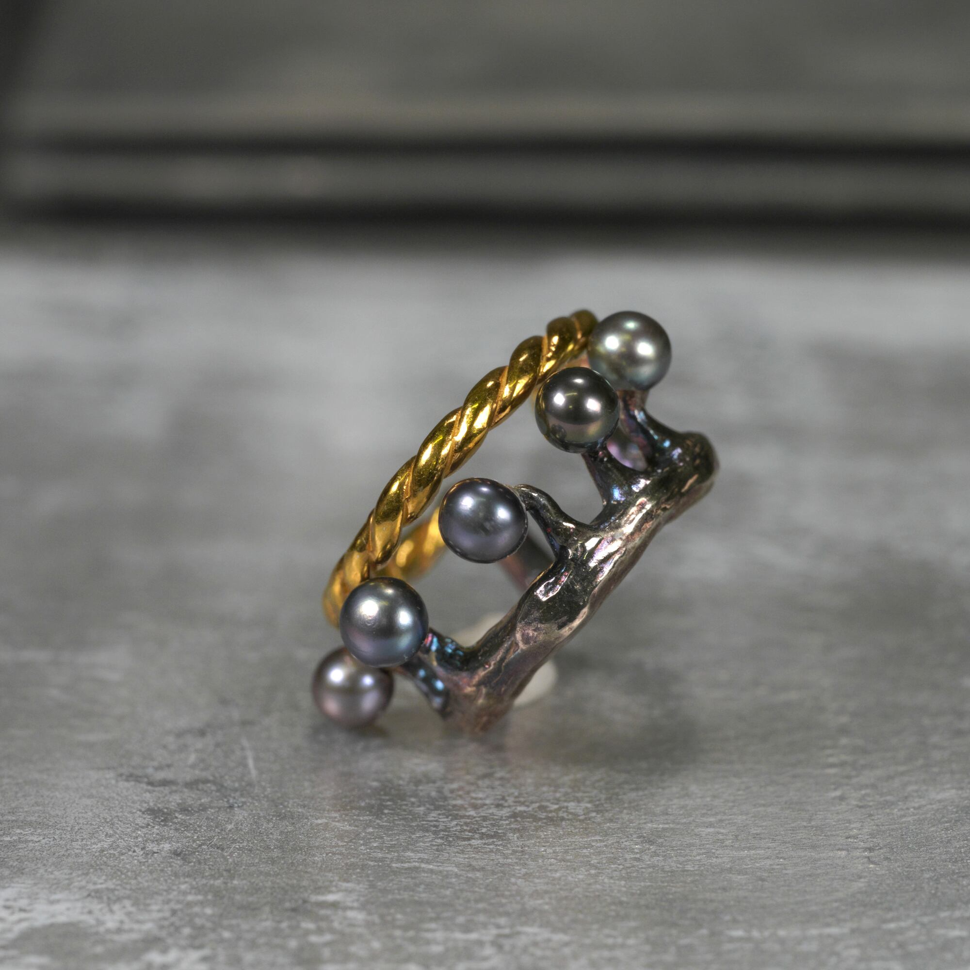 アイドル粘菌ルリホコリのイヤーカフです。 シルバー925製、子実体は淡水パールで表現しています。 燻しとゴールド/シルバーのコントラストが目を引きます。毎日使えるデザインに仕立てました。 Silver925.K24メッキ 燻し仕上げ,淡水パール