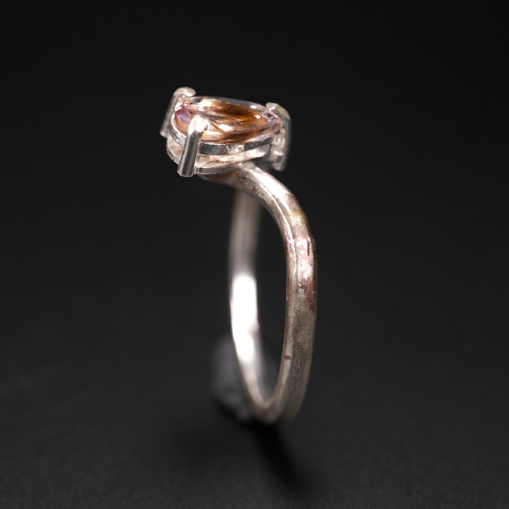 枯れた風合いの四分一銀とティアドロップ型のアメシストを華奢な印象のリングにしました。アメシスト(紫水晶)の中には針状の「ゲーサイト(針鉄鉱)」という鉱物が内包されています。身に付けた時の石の位置にこだわりました。