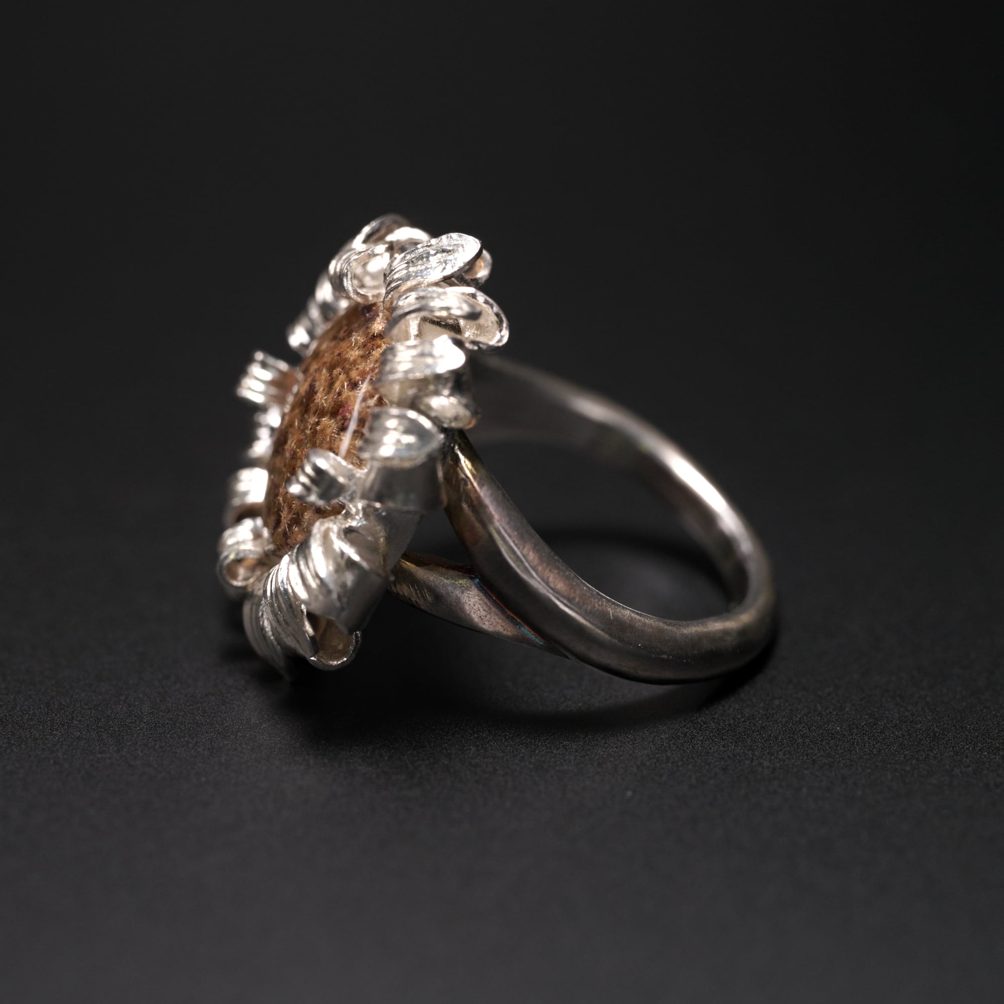 水晶に内包されたルチル(金紅石)の結晶がウニのように放射状にたくさん出ています。フラワールチルというレアな天然石です。まるでひまわりの種のようだったので、ゴッホの『ひまわり』をイメージして制作しました。花弁もすべて銀の板材から手作りしています。花弁で石を留めているちょっと特殊な石留め技法にもご注目ください。