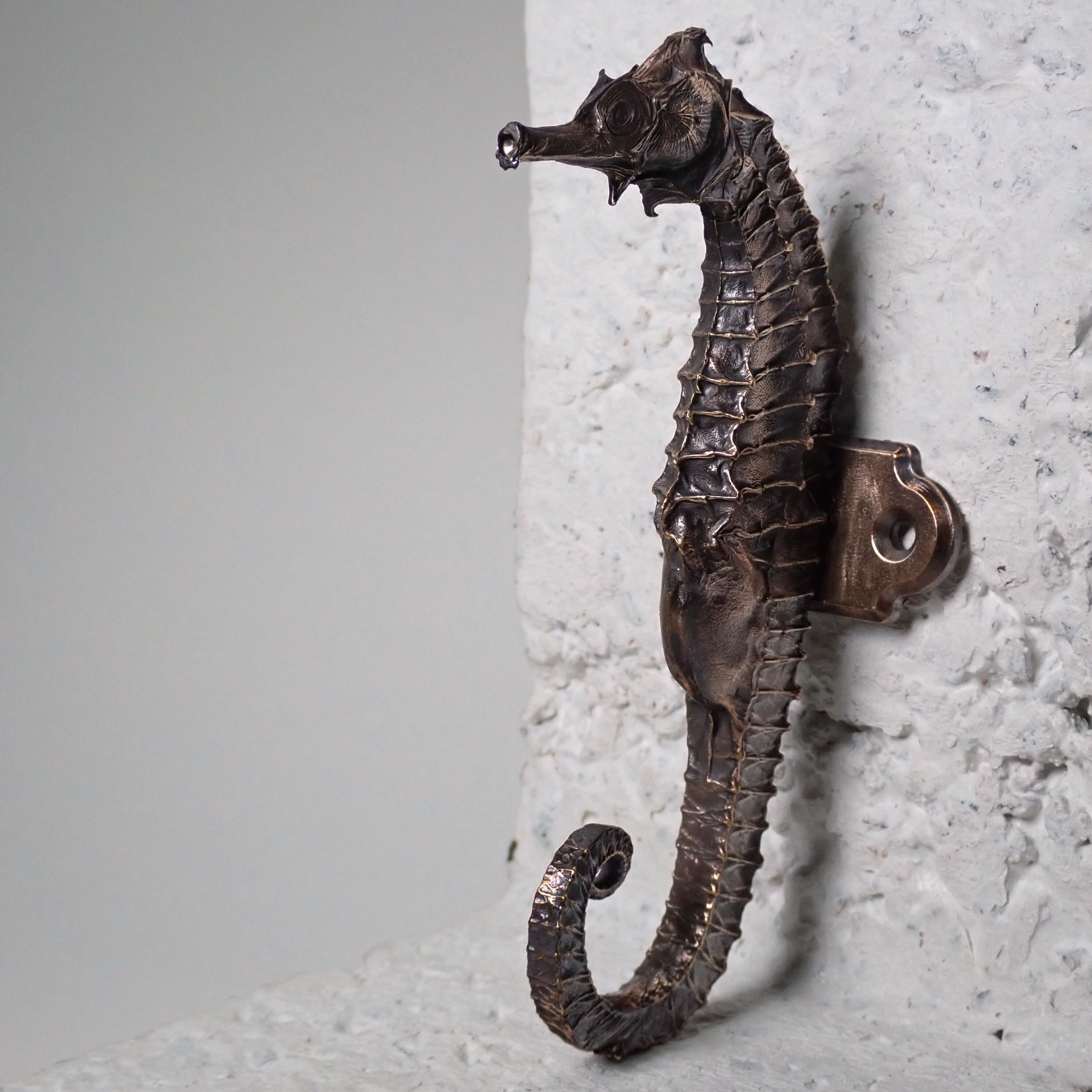 タツノオトシゴの尻尾がフックになっています。取り付けるだけで家具が一気にかっこよくなります。硬いベリリウム銅製で頑丈です。燻し仕上げ。