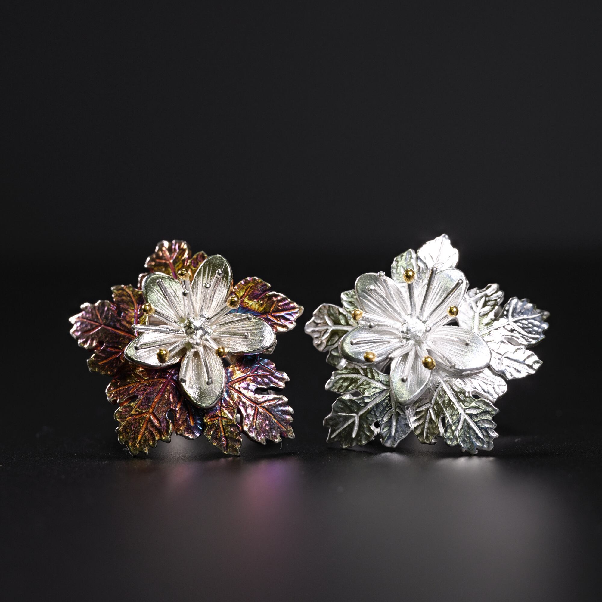 葉の形や葉脈、雄しべの彩色にこだわりました。白仕上げ/燻しの2タイプ。